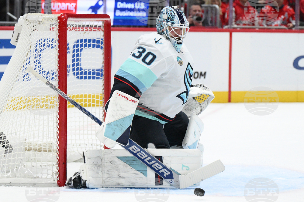 Seattle Kraken goaltender Matt Murray (30) watches the puck during the first period of an NHL hockey game against the Washington Capitals, Tuesday, Oct. 21, 2025, in Washington. (AP Photo/Nick Wass)