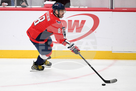 Washington Capitals left wing Alex Ovechkin (8) skates with the puck during the third period of an NHL hockey game against the Seattle Kraken, Tuesday, Oct. 21, 2025, in Washington. (AP Photo/Nick Wass)