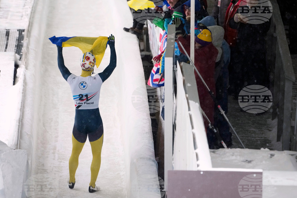 FILE - Valdyslav Heraskevych, of Ukraine, waves a flag as he finishes his second run during the World Cup skeleton competition in Lake Placid, N.Y., March 21, 2024. (AP Photo/Seth Wenig)