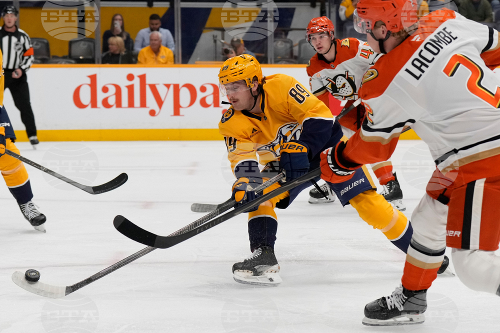 Nashville Predators right wing Ozzy Wiesblatt (89) deflects a shot by Anaheim Ducks defenseman Jackson LaCombe (2) during the first period of an NHL hockey game Tuesday, Oct. 21, 2025, in Nashville, Tenn. (AP Photo/George Walker IV)