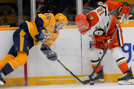 Nashville Predators defenseman Brady Skjei (76) and Anaheim Ducks right wing Sam Colangelo (12) battle for the puck during the first period of an NHL hockey game Tuesday, Oct. 21, 2025, in Nashville, Tenn. (AP Photo/George Walker IV)