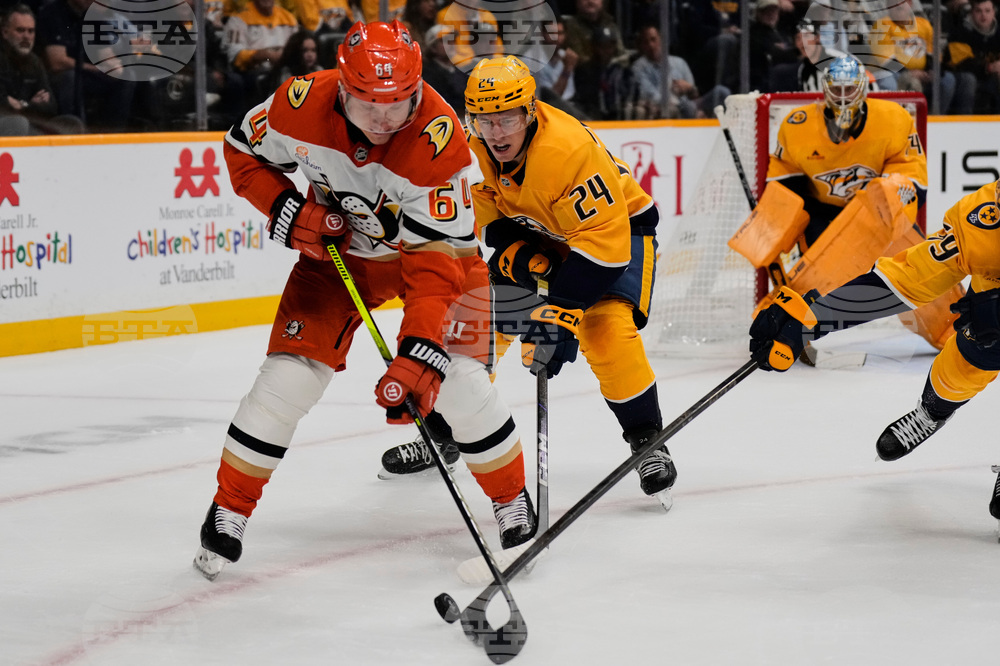 Anaheim Ducks center Mikael Granlund (64) and Nashville Predators defenseman Spencer Stastney (24) chase the puck during the first period of an NHL hockey game Tuesday, Oct. 21, 2025, in Nashville, Tenn. (AP Photo/George Walker IV)
