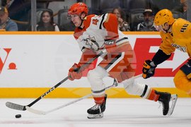 Nashville Predators defenseman Nick Perbix (48) shoots the puck past Anaheim Ducks left wing Cutter Gauthier (61) during the second period of an NHL hockey game Tuesday, Oct. 21, 2025, in Nashville, Tenn. (AP Photo/George Walker IV)