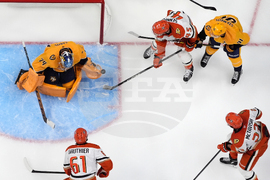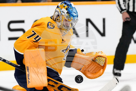 Nashville Predators goaltender Juuse Saros (74) defends the goal during the first period of an NHL hockey game against the Anaheim Ducks, Tuesday, Oct. 21, 2025, in Nashville, Tenn. (AP Photo/George Walker IV)