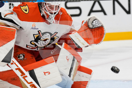 Anaheim Ducks goaltender Lukas Dostal (1) blocks a shot on goal during the second period of an NHL hockey game against the Nashville Predators, Tuesday, Oct. 21, 2025, in Nashville, Tenn. (AP Photo/George Walker IV)
