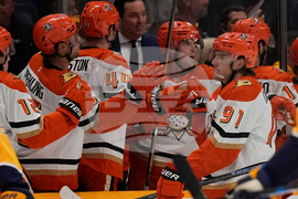 Anaheim Ducks center Leo Carlsson (91) celebrates his goal with teammates during the second period of an NHL hockey game against the Nashville Predators, Tuesday, Oct. 21, 2025, in Nashville, Tenn. (AP Photo/George Walker IV)