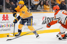 Nashville Predators left wing Erik Haula (56) passes the puck away from Anaheim Ducks defenseman Jacob Trouba (65) during the second period of an NHL hockey game Tuesday, Oct. 21, 2025, in Nashville, Tenn. (AP Photo/George Walker IV)