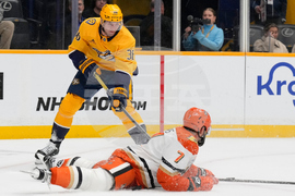 Anaheim Ducks center Ryan Poehling (25) is knocked off is skates by Nashville Predators defenseman Brady Skjei, left, during the third period of an NHL hockey game Tuesday, Oct. 21, 2025, in Nashville, Tenn. (AP Photo/George Walker IV)