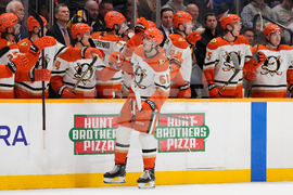 Anaheim Ducks left wing Cutter Gauthier (61) celebrates his goal with teammates during the second period of an NHL hockey game against the Nashville Predators, Tuesday, Oct. 21, 2025, in Nashville, Tenn. (AP Photo/George Walker IV)