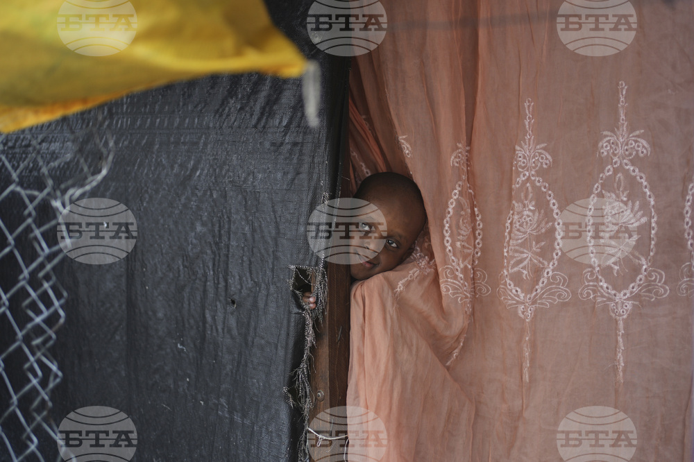 A child pokes his head out from behind a curtain at a shelter for families displaced by gang violence in Port-au-Prince, Haiti, Tuesday, Oct. 21, 2025. (AP Photo/Odelyn Joseph)