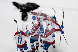 Colorado Avalanche defenseman Cale Makar (8) and teammates Zakhar Bardakov, Devon Toews (7), Gavin Brindley and Parker Kelly (17) celebrate a goal scored by Makar during the first period of an NHL hockey game against the Utah Mammoth, Tuesday, Oct. 21, 2025, in Salt Lake City. (AP Photo/Tyler Tate)