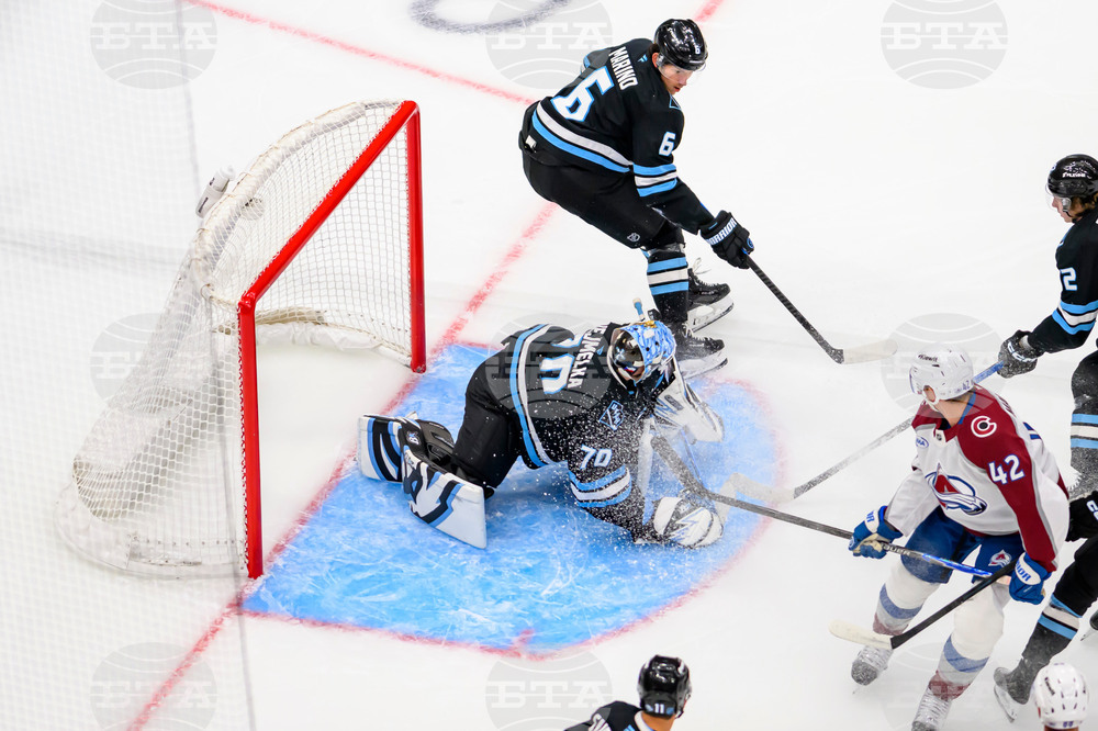 Utah Mammoth right wing Dylan Guenther (11) and right wing JJ Peterka (77) play the puck towards the goal defended by Colorado Avalanche right wing Valeri Nichushkin (13) and defenseman Cale Makar (8) as goaltender Scott Wedgewood (41) protects the net during the first period of an NHL hockey game Tuesday, Oct. 21, 2025, in Salt Lake City. (AP Photo/Tyler Tate)