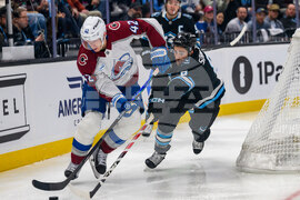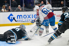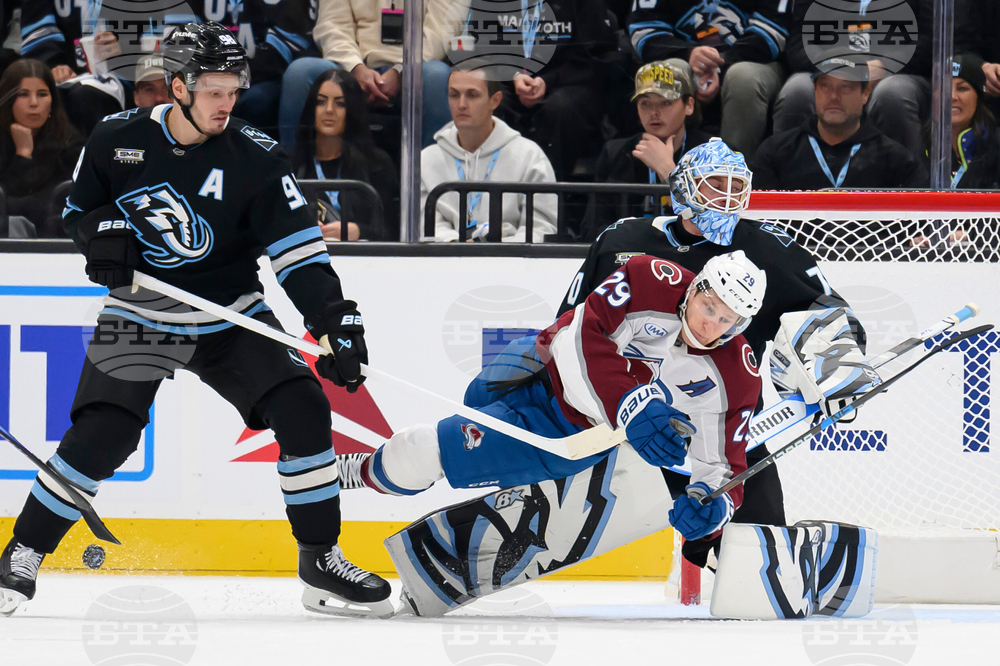 Colorado Avalanche center Nathan MacKinnon (29) is knocked down in front of Utah Mammoth goaltender Karel Vejmelka (70) by Utah Mammoth defenseman Mikhail Sergachev (98) during the second period of an NHL hockey game Tuesday, Oct. 21, 2025, in Salt Lake City, Utah. (AP Photo/Tyler Tate)
