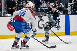 Utah Mammoth left wing Michael Carcone (53) shoots the puck defended by Colorado Avalanche defenseman Brent Burns (84) during the second period of an NHL hockey game Tuesday, Oct. 21, 2025, in Salt Lake City, Utah. (AP Photo/Tyler Tate)