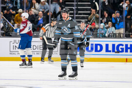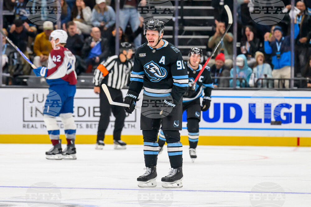 Colorado Avalanche center Martin Necas (88) celebrates scoring a goal during the third period of an NHL hockey game against the Utah Mammoth, Tuesday, Oct. 21, 2025, in Salt Lake City, Utah. (AP Photo/Tyler Tate)