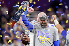 FILE - Los Angeles Rams outside linebacker Von Miller (40) holds up the Vince Lombardi trophy after defeating the Cincinnati Bengals at the NFL Super Bowl 56 football game Sunday, Feb. 13, 2022, in Inglewood, Calif. (AP Photo/Steve Luciano, File)