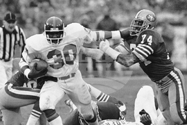 FILE - San Francisco 49ers defensive end Fred Dean (74) gets a hand on New York Giants running back Tony Galbreath (30) during the fourth quarter of an NFL football playoff game at Candlestick Park, Dec. 31, 1984 in San Francisco. (AP Photo/File)