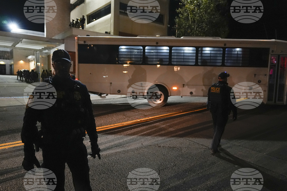 Law enforcement officers line the road outside a United States Immigration and Customs Enforcement (ICE) facility as a bus leaves with passengers on Tuesday, Oct. 21, 2025, in Portland, Ore. (AP Photo/Jenny Kane)