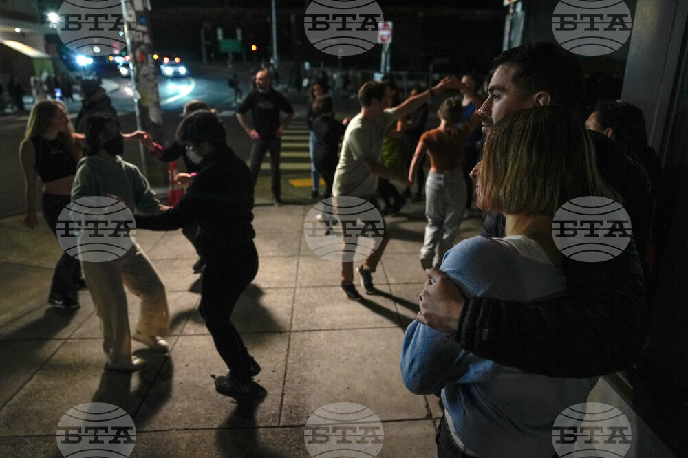 People dance near a United States Immigration and Customs Enforcement (ICE) facility on Tuesday, Oct. 21, 2025, in Portland, Ore. (AP Photo/Jenny Kane)