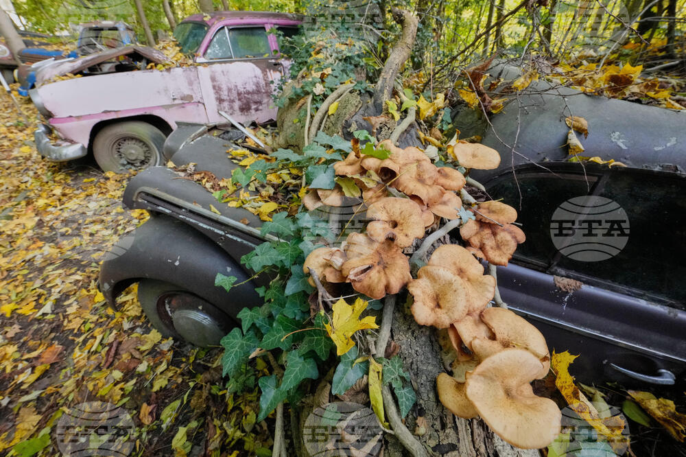 Mushrooms grow around vintage cars at a private car sculpture park within a forest in Neanderthal Valley in Mettmann, Germany, Sunday, Oct. 19, 2025. (AP Photo/Martin Meissner)