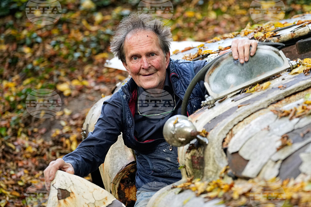 Car collector Michael Froehlich poses for a portrait from a vintage Jaguar XK120 car at his private car sculpture park within a forest in Neanderthal Valley in Mettmann, Germany, Sunday, Oct. 19, 2025. (AP Photo/Martin Meissner)