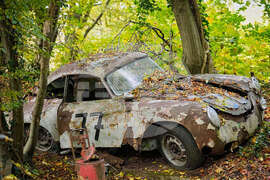 Vintage cars are covered by fall leaves inside a private car sculpture park within a forest in Neanderthal Valley in Mettmann, Germany, Sunday, Oct. 19, 2025. (AP Photo/Martin Meissner)