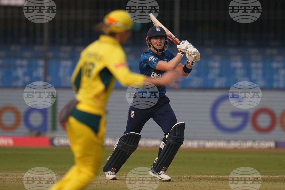 England's Lauren Bell, second from right, celebrates the wicket of Australia's Phoebe Litchfield during the ICC Women's Cricket World Cup cricket match between England and Australia at Holkar Cricket Stadium in Indore, India, Wednesday, Oct. 22, 2025. (AP Photo/Rafiq Maqbool)