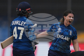 England's Linsey Smith , left, celebrates the wicket of Australia's Georgia Voll , centre, during the ICC Women's Cricket World Cup cricket match between England and Australia at Holkar Cricket Stadium in Indore, India, Wednesday, Oct. 22, 2025. (AP Photo/Rafiq Maqbool)