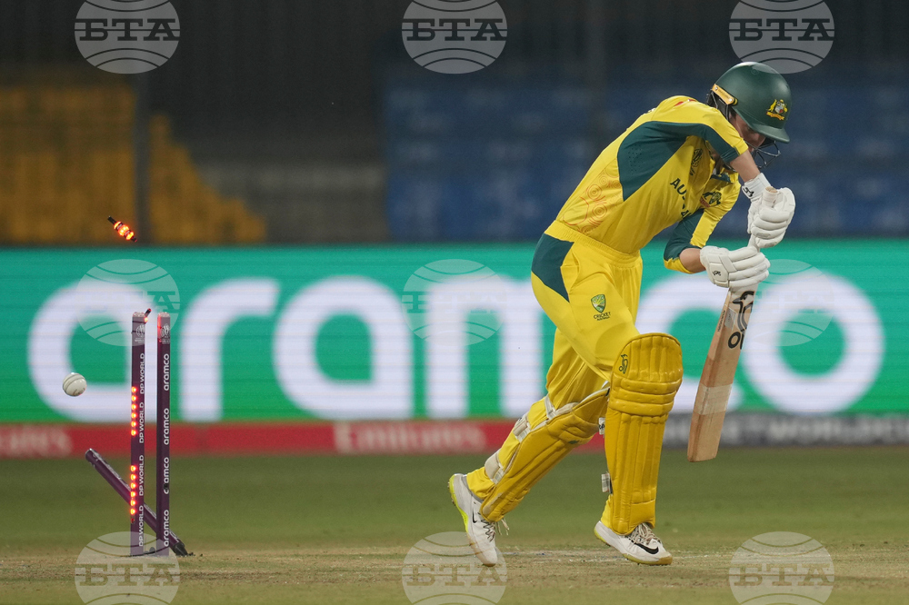 Australia's Phoebe Litchfield is bowled out by England's Lauren Bell during the ICC Women's Cricket World Cup cricket match between England and Australia at Holkar Cricket Stadium in Indore, India, Wednesday, Oct. 22, 2025. (AP Photo/Rafiq Maqbool)