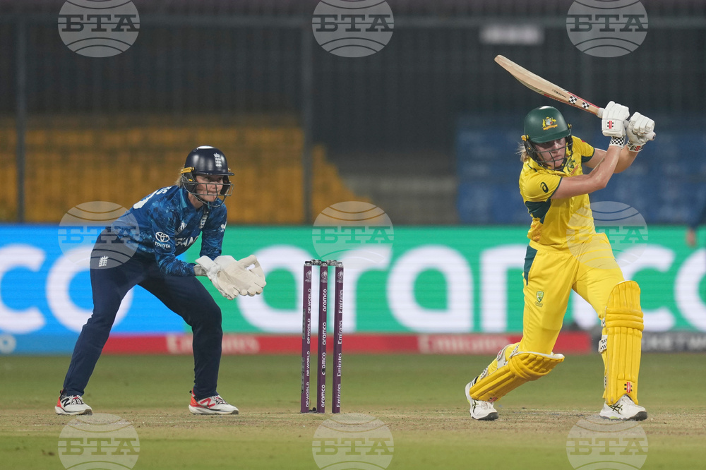 Australia's Beth Mooney celebrates the wicket of England's Sophia Dunkley during the ICC Women's Cricket World Cup cricket match between England and Australia at Holkar Cricket Stadium in Indore, India, Wednesday, Oct. 22, 2025. (AP Photo/Rafiq Maqbool)