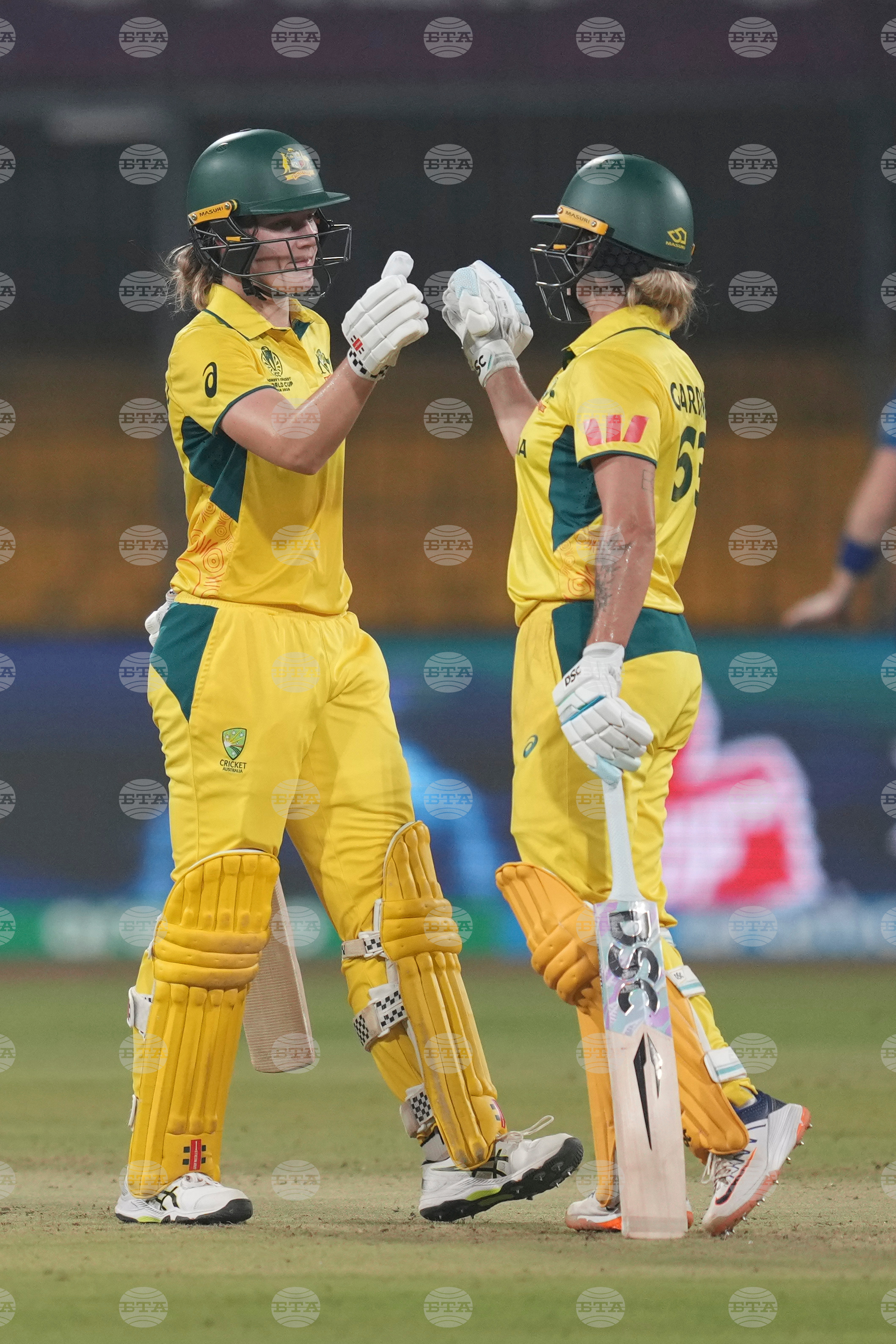 Australia's Ashleigh Gardner, left, celebrates her fifty runs as Australia's Annabel Sutherland looks on during the ICC Women's Cricket World Cup cricket match between England and Australia at Holkar Cricket Stadium in Indore, India, Wednesday, Oct. 22, 2025. (AP Photo/Rafiq Maqbool)
