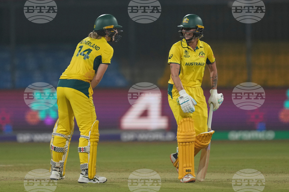 Australia's Ashleigh Gardner ,left, gives fist touch to Australia's Annabel Sutherland during the ICC Women's Cricket World Cup cricket match between England and Australia at Holkar Cricket Stadium in Indore, India, Wednesday, Oct. 22, 2025. (AP Photo/Rafiq Maqbool)