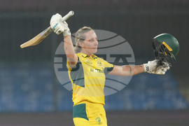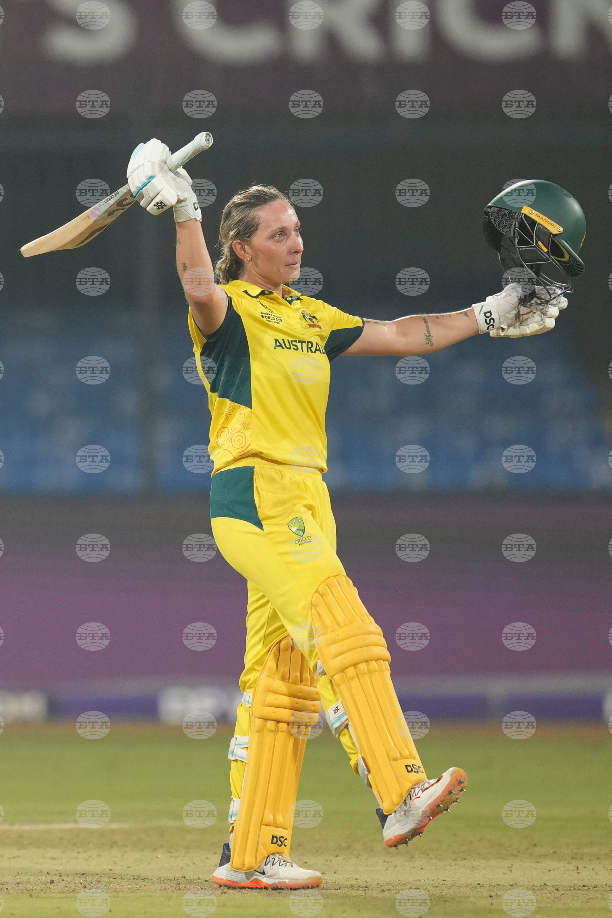 Australia's Beth Mooney reacts during the ICC Women's Cricket World Cup cricket match between England and Australia at Holkar Cricket Stadium in Indore, India, Wednesday, Oct. 22, 2025. (AP Photo/Rafiq Maqbool)