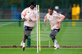 Aston Villa's Amadou Onana and Boubacar Kamara during a training session at Aston Villa FC Training Ground, Birmingham, England,W ednesday Oct. 22, 2025. (Martin Rickett/PA via AP)