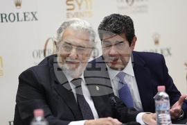 София (22 октомври 2025) В концертен комплекс "България" се провежда пресконференция по повод международния конкурс за млади оперни певци „Опералия 2025“, организиран от продуцентската компания на оперната прима Соня Йончева - SY11 Events и Софийската филхармония. На снимката (от ляво надясно): тенорът Пласидо Доминго и вицепрезидентът на "Опералия" Алваро Доминго.