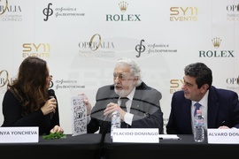 София (22 октомври 2025) В концертен комплекс "България" се провежда пресконференция по повод международния конкурс за млади оперни певци „Опералия 2025“, организиран от продуцентската компания на оперната прима Соня Йончева - SY11 Events и Софийската филхармония. На снимката (от ляво надясно): оперната прима Соня Йончева, тенорът Пласидо Доминго и вицепрезидентът на "Опералия" Алваро Доминго.