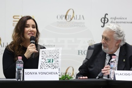 София (22 октомври 2025) В концертен комплекс "България" се провежда пресконференция по повод международния конкурс за млади оперни певци „Опералия 2025“, организиран от продуцентската компания на оперната прима Соня Йончева - SY11 Events и Софийската филхармония. На снимката (от ляво надясно): оперната прима Соня Йончева и тенорът Пласидо Доминго.