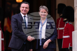 Britain's Foreign Secretary Yvette Cooper welcomes Kosovo's Prime Minister Albin Kurti to a meeting of leaders of six Western Balkan nations with British and European officials at a Western Balkans Summit in London, Wednesday, Oct. 22, 2025.(AP Photo/Kirsty Wigglesworth, Pool)