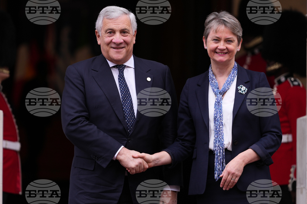 Britain's Foreign Secretary Yvette Cooper welcomes Italy's Foreign Minister Antonio Tajani to a meeting of leaders of six Western Balkan nations with British and European officials at a Western Balkans Summit in London, Wednesday, Oct. 22, 2025.(AP Photo/Kirsty Wigglesworth, Pool)