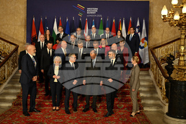 Leaders and delegates pose for the group photo during a Western Balkans Summit in London, Wednesday, Oct. 22, 2025. (Chris J Ratcliffe/Pool Photo via AP)