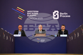 Britain's Prime Minister Keir Starmer, center, flanked by German Chancellor Friedrich Merz, left, and Montenegro's Prime Minister Milojko Spajic, hosts the plenary session of the Western Balkans Summit Western Balkans Summit in London, Wednesday, Oct. 22, 2025. (Chris J Ratcliffe/Pool Photo via AP)