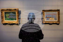 A visitor looks on the painting Lagoon on the Seine, left, and White Boots from Pierre Bonnard at a press preview for the exhibition "The Scharf Collection: Goya – Monet – Cezanne – Bonnard – Grosse" at the Alte Nationalgalerie museum in Berlin, Wednesday, Oct. 22, 2025. (AP Photo/Maryam Majd)