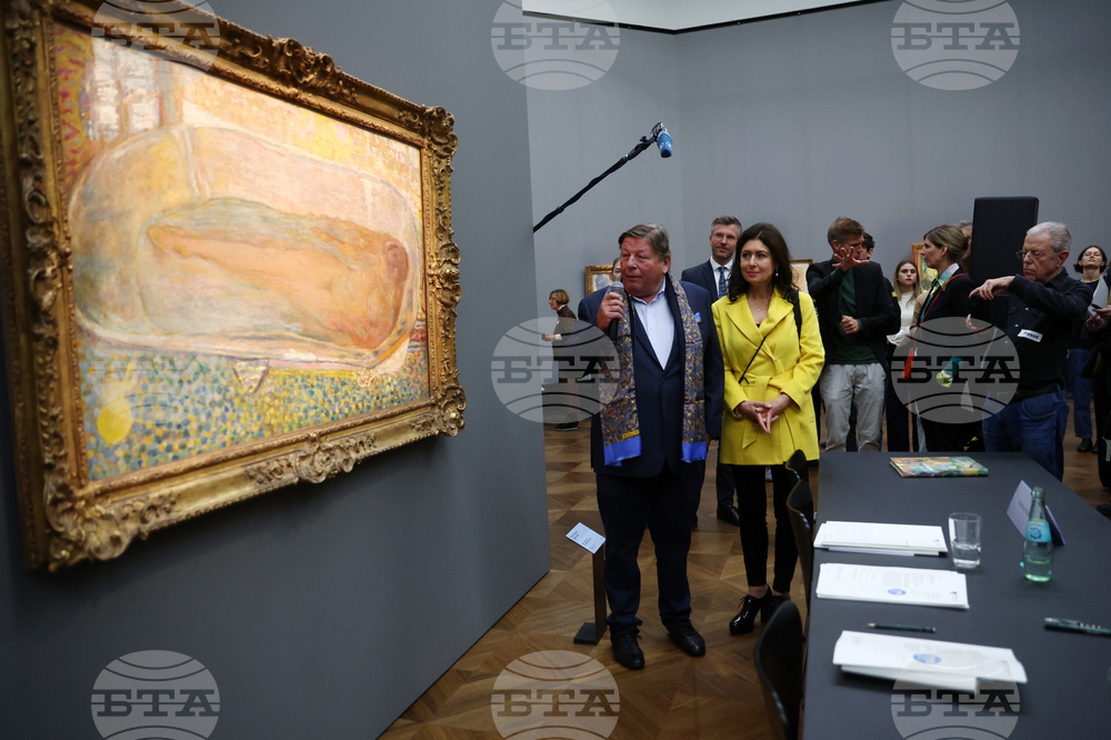 René Scharf, center left, and his wife Christiane, center right, stand next to the painting "The Big bath" by Pierre Bonnard as they attend a press preview for the exhibition "The Scharf Collection: Goya – Monet – Cézanne – Bonnard – Grosse" at the Alte Nationalgalerie museum in Berlin, Wednesday, Oct. 22, 2025. (AP Photo/Maryam Majd)