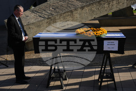 Israeli Minister of Justice Yariv Levin pays his respects beside the coffin of Sonthaya Oakkharasri, a Thai national who was killed and taken hostage by Hamas into Gaza, before his body is flown back to Thailand for burial, at Ben Gurion Airport in Lod, Israel, on Wednesday, Oct. 22, 2025. (AP Photo/Ariel Schalit)