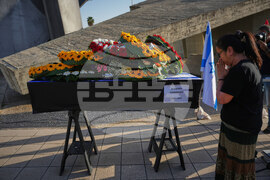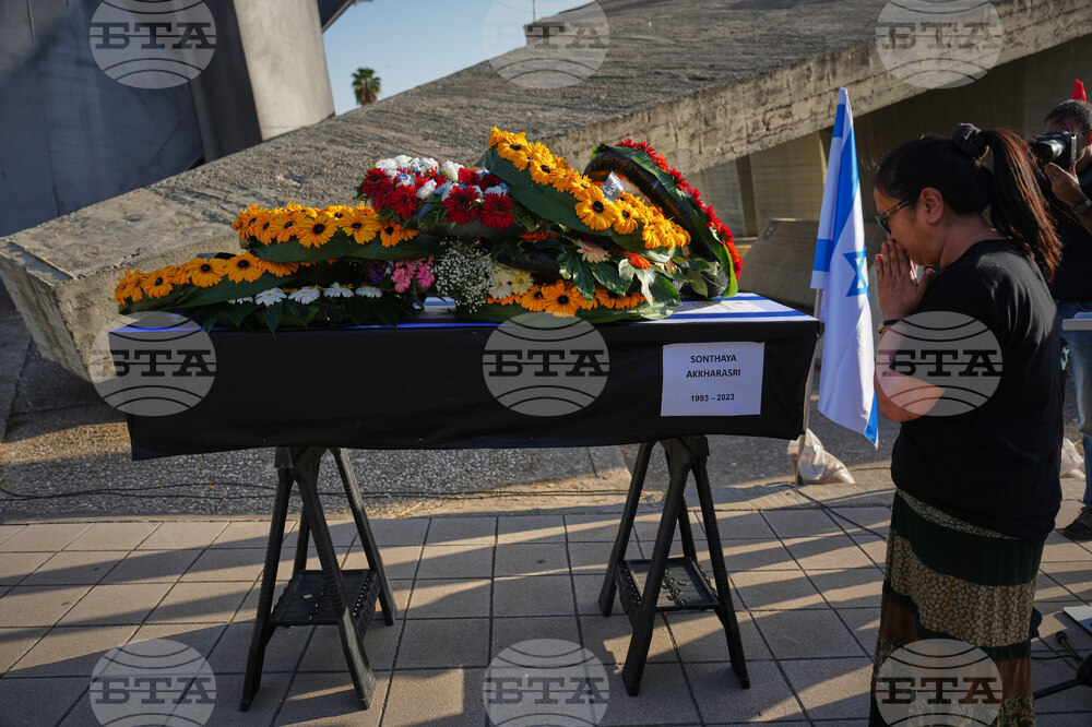 Friends attend the at a farewell ceremony for Sonthaya Oakkharasri, a Thai national who was killed and taken hostage by Hamas into Gaza, before his body is flown back to Thailand for burial, at Ben Gurion Airport in Lod, Israel, on Wednesday, Oct. 22, 2025. (AP Photo/Ariel Schalit)
