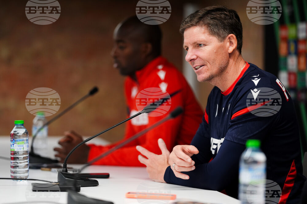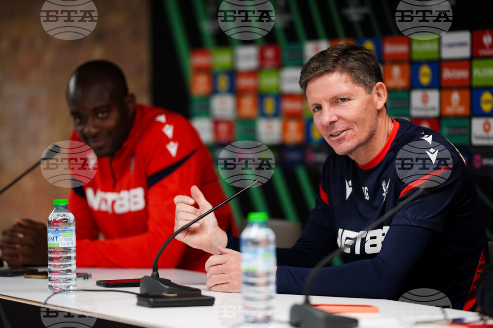 Crystal Palace manager Oliver Glasner, right, with Jean-Philippe Mateta during a press conference at the Crystal Palace FC Academy, Beckenham, England, Wednesday, Oct. 22, 2025. (John Walton/PA via AP)