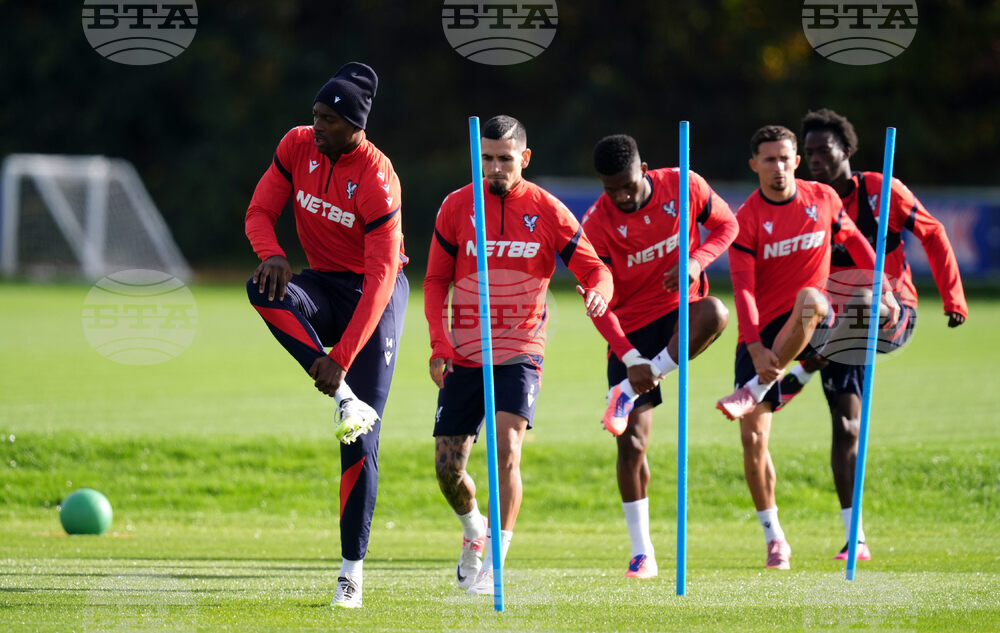 Crystal Palace players practice during a training session at Crystal Palace Training Ground, in London, Wednesday Oct. 22, 2025. (John Walton/PA via AP)
