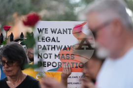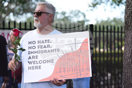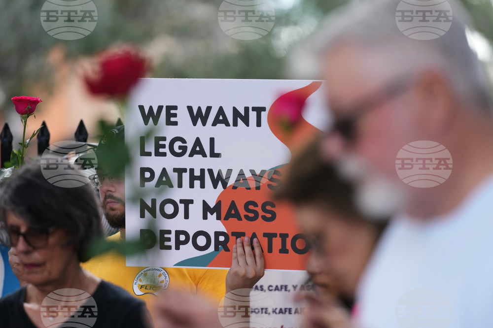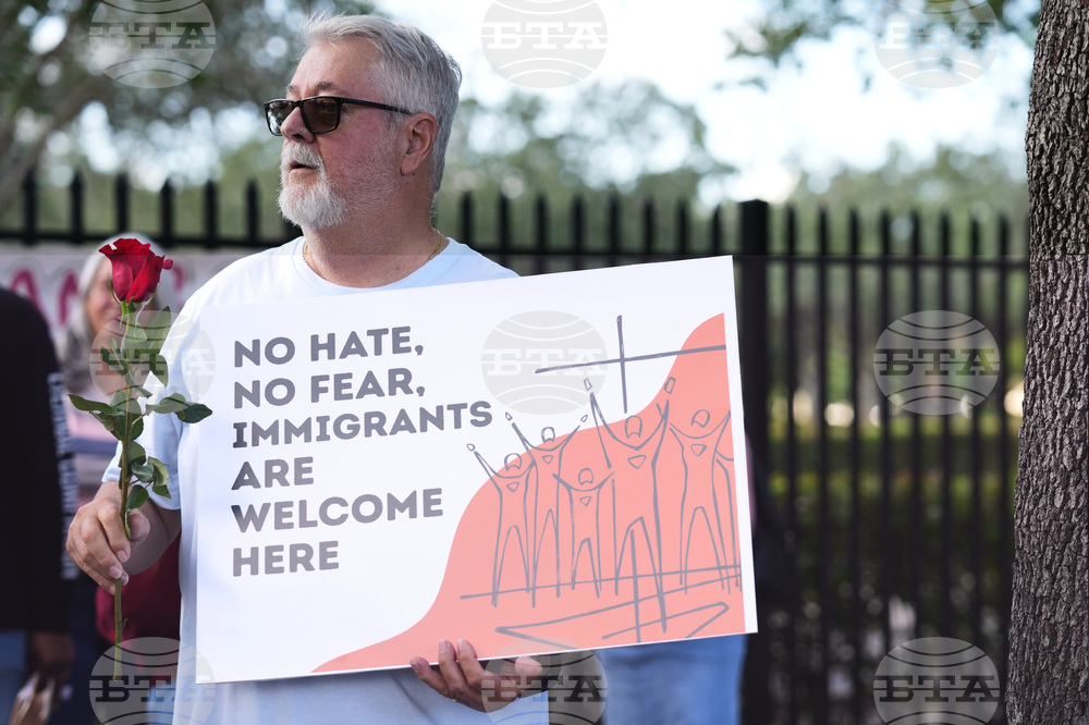 Raul Fernandez attends a prayer service in support of immigrants outside of an ICE processing facility, Wednesday, Oct. 22, 2025, in Miramar, Fla. (AP Photo/Lynne Sladky)