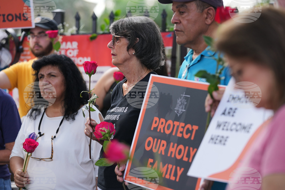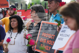 People hold red roses as they attend a prayer service in support of immigrants outside of an ICE processing facility, Wednesday, Oct. 22, 2025, in Miramar, Fla. (AP Photo/Lynne Sladky)