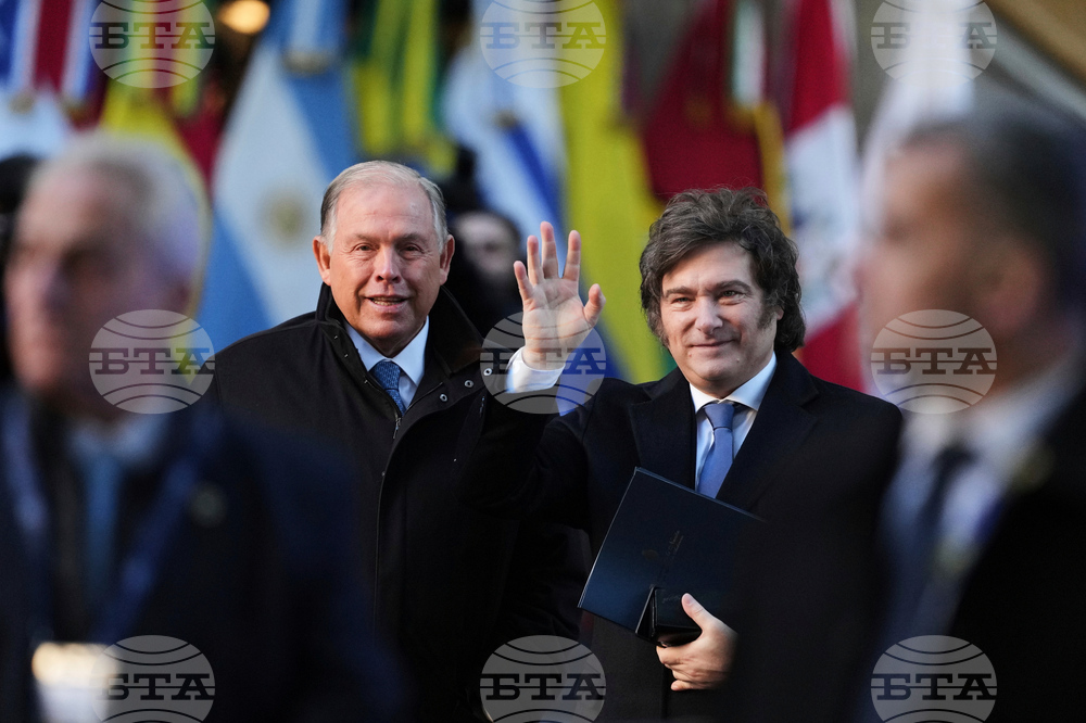 FILE - Argentine President Javier Milei waves to the press next to his Foreign Minister Gerardo Werthein at the Mercosur Summit in Buenos Aires, Argentina, July 3, 2025. (AP Photo/Natacha Pisarenko, File)